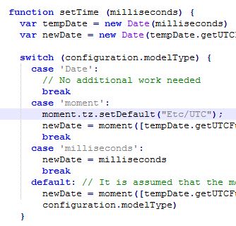 On the datetimepicker.js file, on the function setTime, one line after case ‘moment’ we added moment.tz.setDefault(“Etc/UTC”) in order to enforce the timezone to UTC every time we are setting a date.