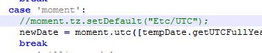 Further action: Doing some more testing we discovered that by using moment.utc() we don’t really need add moment-timezone or do the setDefault(“Etc/UTC”) thing. We have not given this a huge amount of testing, but the code would look like this: